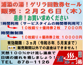 2/26(木)1日限定で、浦添の湯回数券セールを開催いたします!
