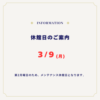 3/9(月)は第2月曜日のためメンテナンス休館日となります。